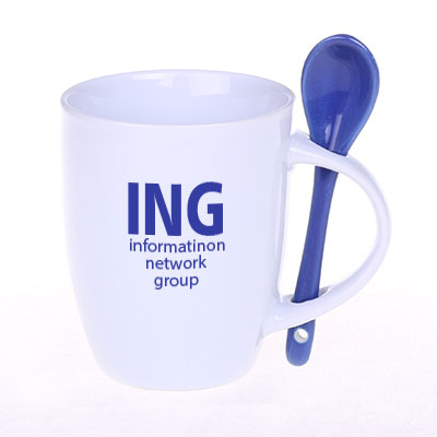 Una tazza con interno colorato ed esterno bianco. Il set comprende un cucchiaino in ceramica. La forma del manico permette di inserire il cucchiaino. Questo prodotto è un fine serie e potrebbe presentare fori, punti e differenze nella tonalità dello smalto.