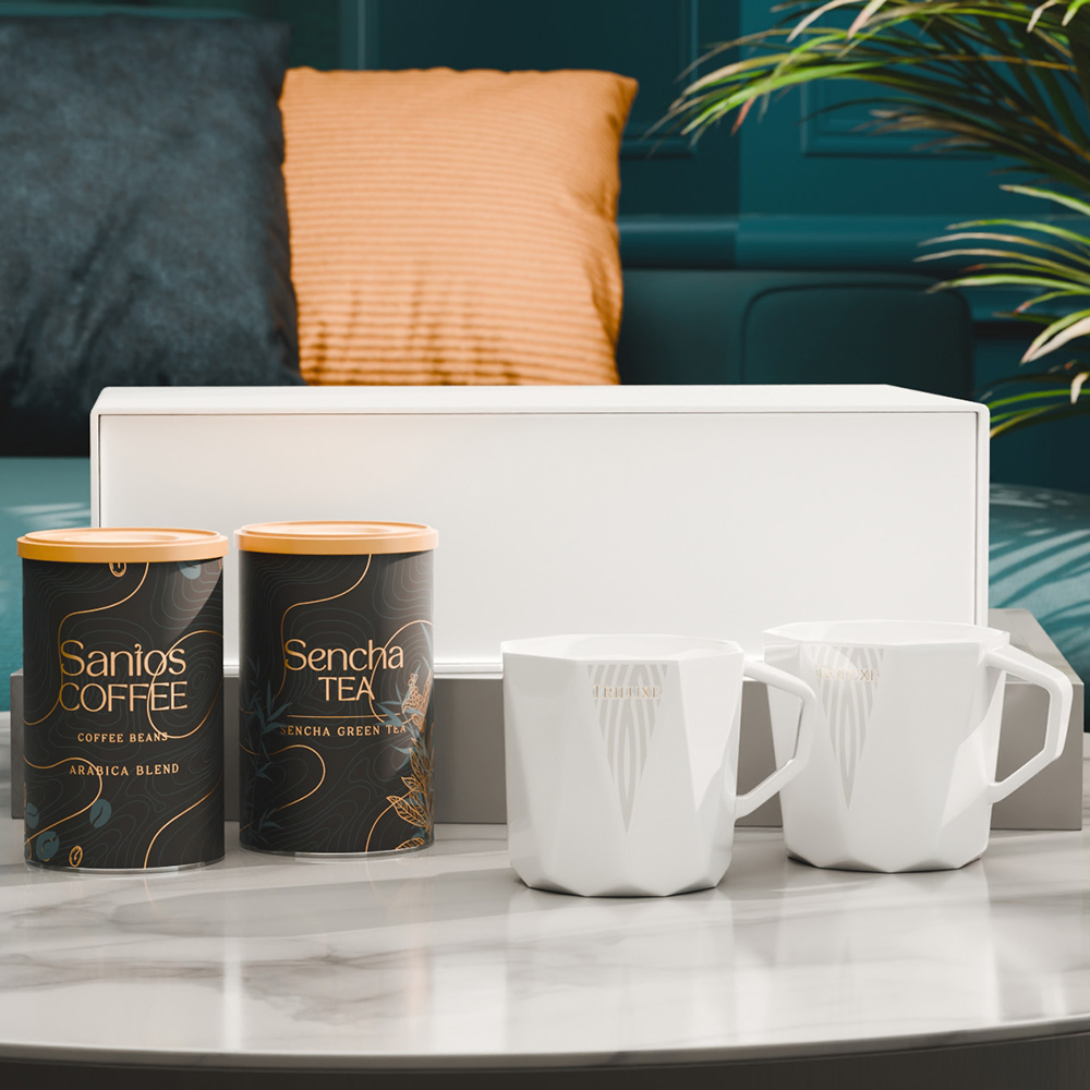 Un set di lusso basato su tazze Crown a parete sottile in Fine Bone China è un vero manifesto di prestigio. All’interno sono inclusi anche il caffè selezionato “Santos Coffee” e il tè “Sencha Tea”, confezionati in eleganti lattine. Il tutto è racchiuso in una confezione esclusiva, bianco neve, con chiusura magnetica.